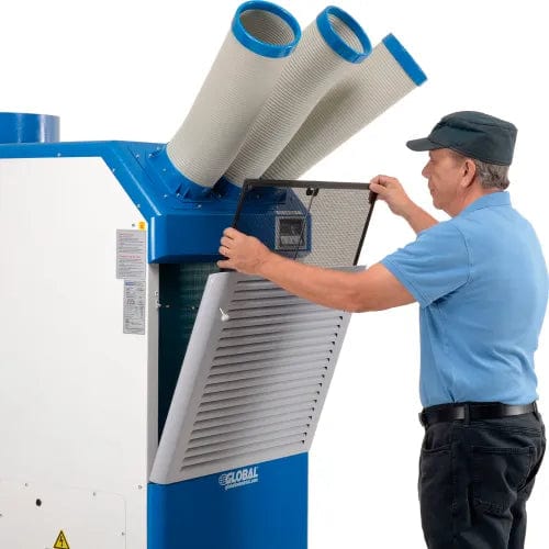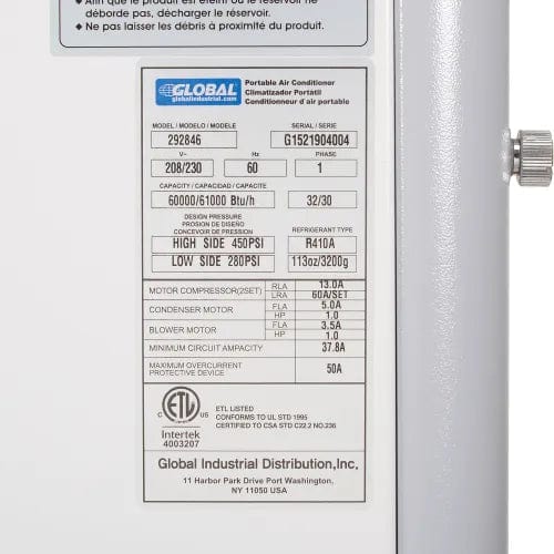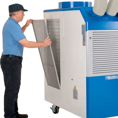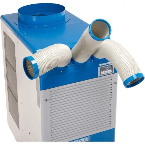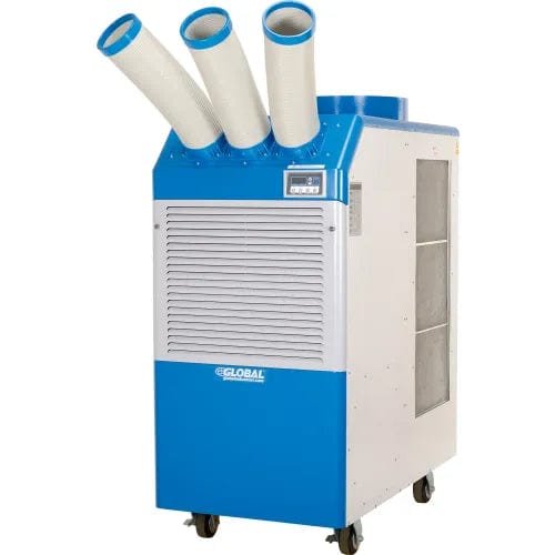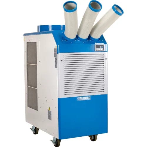 With this 60,000 BTU Global Industrial™ Portable Air Conditioner, you can provide spot cooling between 64 and 86°F and 32 to 86°F room cooling for up to 1600 ft2 in industrial plants, server rooms, hospitals, laboratories, and where electrical equipment creates additional heat within 64 to 113°F ambient temperature range. The thermostatically-protected compressor has two fan speeds to give you control of the cooling. Removable filters clean the air as it cools to improve air quality, and they are washable for easy maintenance. Three Cold Air Nozzles are included and are recommend for use with the air conditioner with replacements available separately. The housing is made of galvanized steel for durability and moves easily on four swivel casters, two locking, for optimal portability as needs change. Limited 3-Year Warranty.