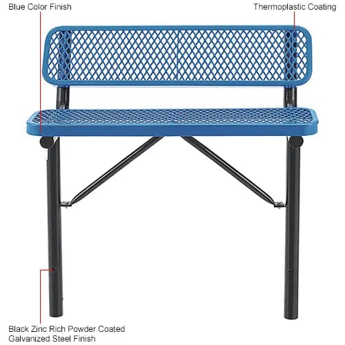 Centerline Dynamics Outdoor Seating 4' Outdoor Steel Bench w/ Backrest, Expanded Metal, In Ground Mount, Blue