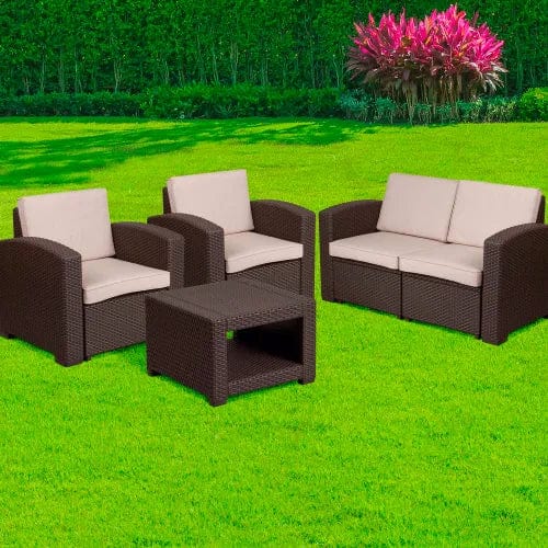 - 4 Piece Faux Rattan Outdoor Patio Set, Chocolate Brown w/ Beige Cushions