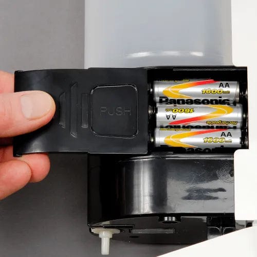 Automatic soap dispensers deliver measured amounts of soap to prevent waste and improve sanitation. Soap dispenser automatically activates with user's motion, operates quietly, and automatically shuts off when hands are removed from sensor range. This automatic soap dispenser is battery operated, and battery chambers are key locked.