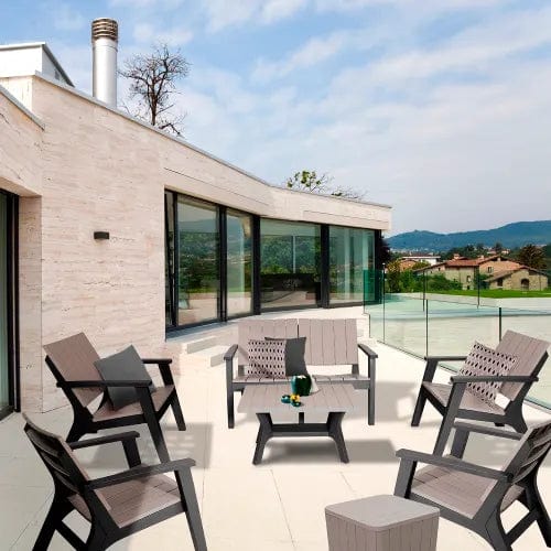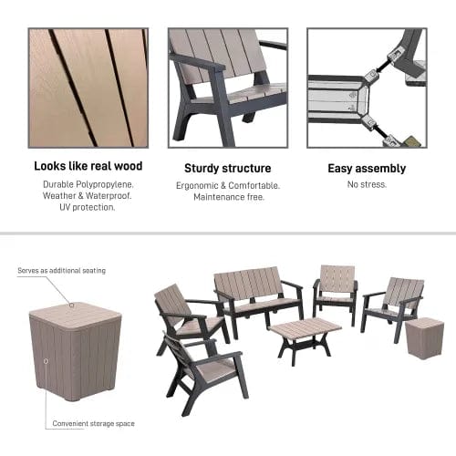 Attractive rustic-style outdoor conversation set, looks like real wood with a beautiful brushed finish. It is crafted from highly durable polypropylene weather resistant and UV protected material so you can enjoy the advantages of full weather and water resistance, no color fading, no rust, and its 100% maintenance free. It is easy to assemble and there are no special tools required. This patio furniture is effortless to move around and easy to store away, it includes four armchairs, one loveseat, one table and one coffee table with convenient storage space for essentials and serves as additional seating, delight your home with the comfort and design you deserve.