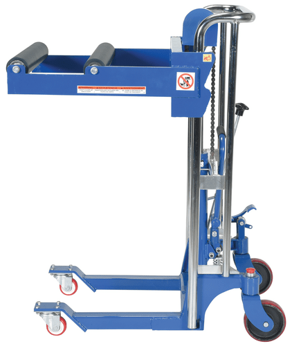 he roller work positioner is a wonderful addition to material handling and shipping facilities. The positioner allows the user to transport heavy large rolls of material with ease. The simple cradle design of the platform prevents any movement during transporting. A foot pump operation gives the user the ability to adjust the height to an exact measurement for smooth loading/unloading. The attached handle stands at an ergonomic height to diminish the chance of bending during operation. For best use, simply slide the product onto the cradle platform and use the foot pump to adjust the height that best suits the environment.