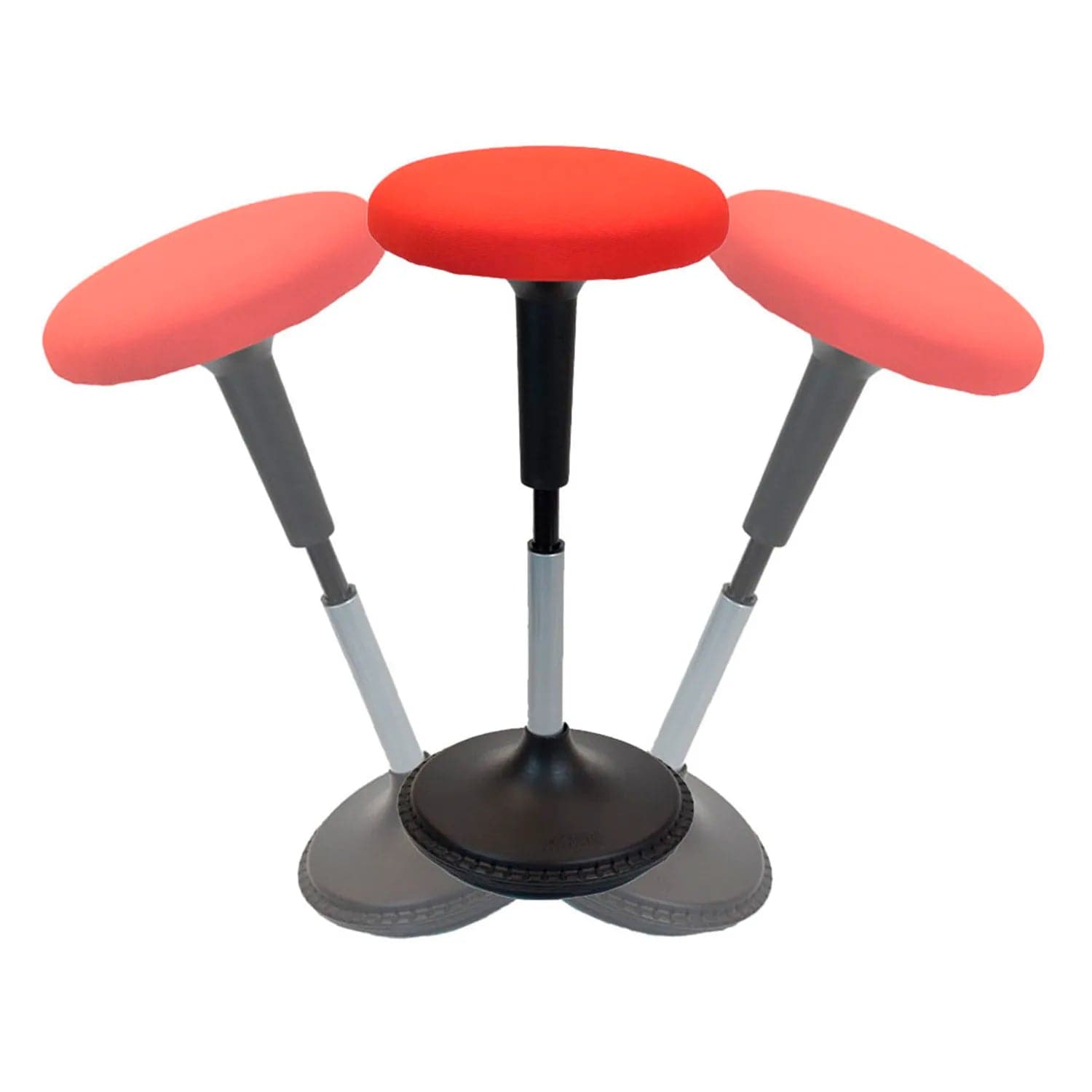 This stool is easy to sit on, quick to get up from the perfect rest spot for a busy person. Plus the plush, padded fabric seat is super comfortable for longer sitting periods. The unique seat shape makes it easy to control the stool, swivels 360°, and adjusts from common chair height (23") up to normal bar stool height (33"). The special rounded base grips most floors, is counter-balanced so you don't have to be in constant motion, and it allows Wobble Stool to return upright after use.