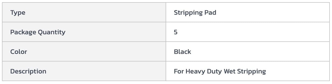 Pad is made using 100% recycled polyester fiber with 80% post consumer waste. Utilizes water-based latex resins in binding process to eliminate hazardous resins. Black stripping pad is for use with machines up to 350 RPM. Ideal for heavy duty wet stripping. Aggressively removes wax, dirt and finish. Sold 5 per case.