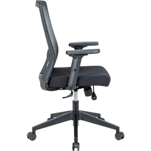 Complete your workstation, cubicle, or desk space with a strong choice for an office chair. Mesh Task Chair with Seat Slider provides comfortable lumbar support in addition to ample leg space. The various levels of height adjustment allow multiple ways for users to keep pressure off the knees during long hours of sitting. Wheel casters permit gliding and roll well on industrial carpeted surfaces. This chair features a class 3 gas lift with a heavy duty nylon base. Ideal for 8-10 hours of use. Standard black finish blends well in office and commercial spaces.