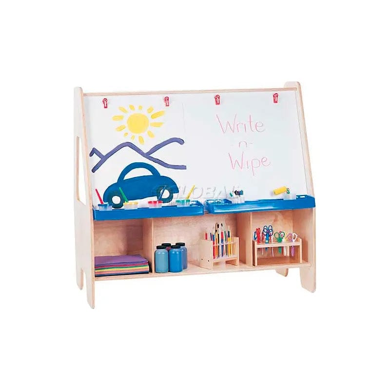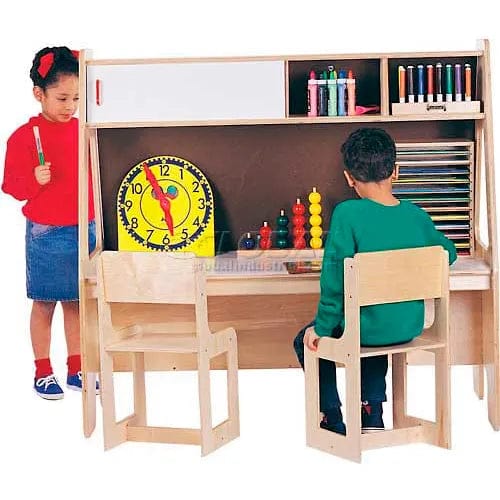Write-n-Wipe easel surface with paper clamps. E-Z to clean laminate desktop. Birch plywood construction. Easel panel options not available. E-Z to clean laminate desktop is 20" high. 49-1/2" long x 29" wide x 48" high.