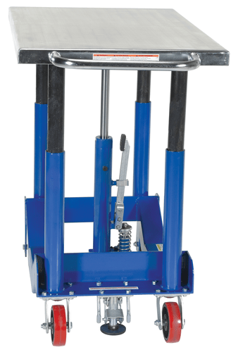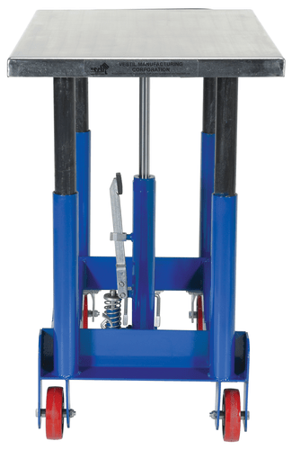 Hydraulic post tables are ideal in material handling facilities. The unit can be of use in a variety of environments from lifting dies and castings to moving machine parts. The corner posts are telescoping to help stabilize and fully support the load during operation. The tables roll smoothly on two (2) locking swivel casters with brakes and two (2) rigid. The tables can be lifted/lowered with a single speed foot pump, two-speed foot pump, two speed auto shifter that automatically shifts when the table is loaded, or linear actuated power.