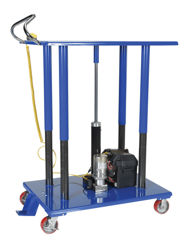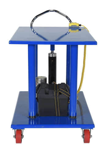 Hydraulic post tables are ideal in material handling facilities. The unit can be of use in a variety of environments from lifting dies and castings to moving machine parts. The corner posts are telescoping to help stabilize and fully support the load during operation. The tables roll smoothly on two (2) locking swivel casters with brakes and two (2) rigid. The tables can be lifted/lowered with a single speed foot pump, two-speed foot pump, two speed auto shifter that automatically shifts when the table is loaded, or linear actuated power.