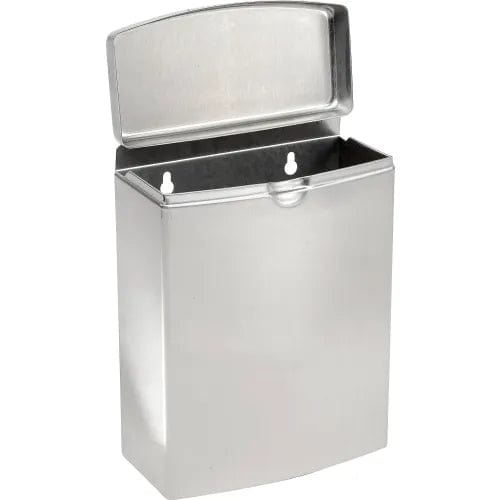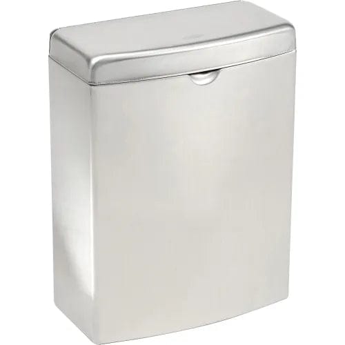 The ConturaSeries® Surface Mounted Sanitary Disposal is practical and goes with any restroom. Constructed of durable, corrosion resistant stainless steel with a satin finish. Drawn, one-piece steel cover is secured to cabinet with full-length stainless steel piano-hinge. Disposal features 1 gallon capacity. Dimensions: 7-1/2"W x 3-13/16"D x 10"H.