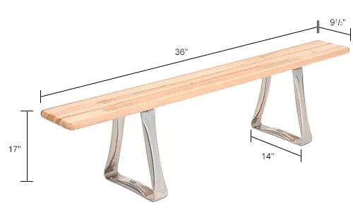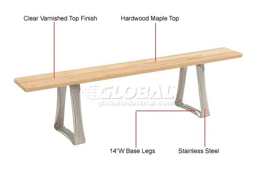 Extra convenience in the locker room. 1-1/4" thick hardwood bench features a heavily varnished top and sturdy stainless steel base. Trapezoid stainless steel 14"W base. Must be anchored to floor for maximum stability. Bench has two pedestals.Locker Bench Hardwood Top w/Stainless Steel Trapezoid Pedestals, Bolt Down Style, 36"W x 9-1/2"D x 17"H