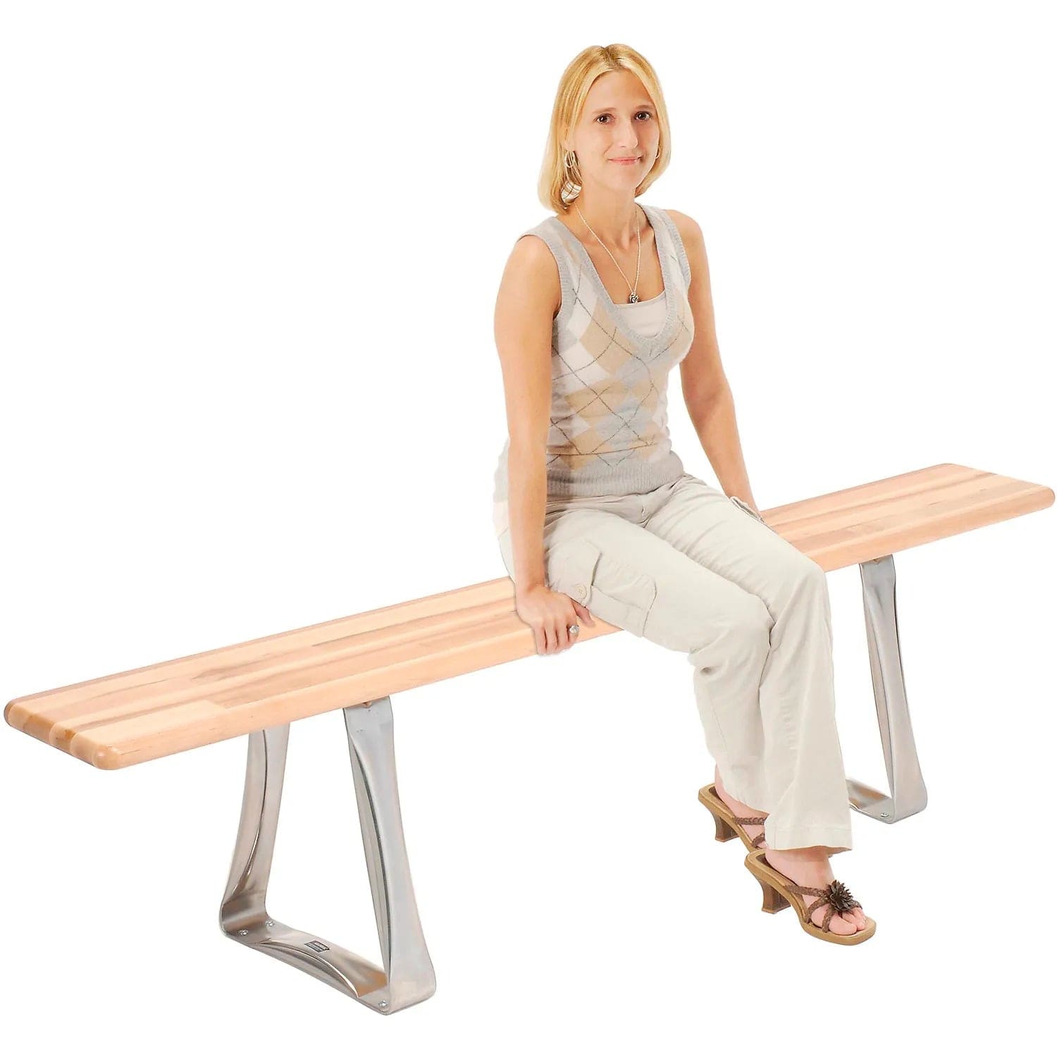 Extra convenience in the locker room. 1-1/4" thick hardwood bench features a heavily varnished top and sturdy stainless steel base. Trapezoid stainless steel 14"W base. Must be anchored to floor for maximum stability. Bench has two pedestals.