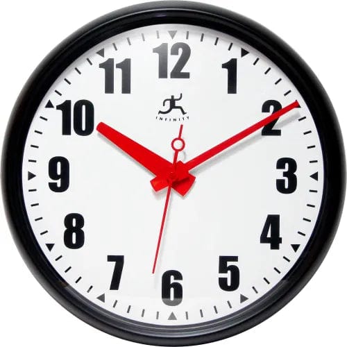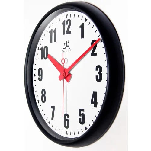 Infinity Instruments Impact wall clock would make a great choice for your home or office. Features large bold numbers and bright red hands so that you can easily see the time. 15" Round Wall Clock, Black Finish Case, Glass Lens, Second Hand.