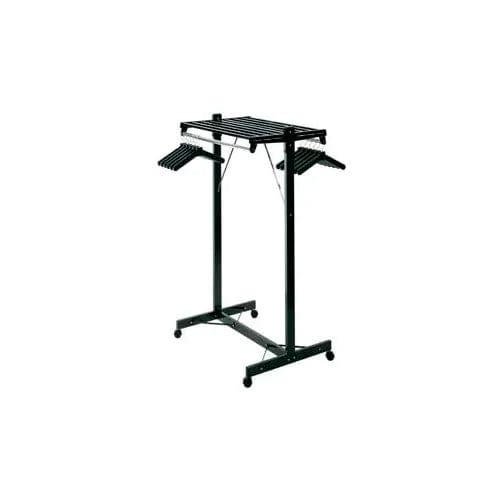 Hanger Style Double Sided Floor Rack with casters-All powder-coated steel construction with 1 nickel chrome hanger bar, capacity-5 hangers per foot. The rack comes with set of (4) 2-1/2" double wheel locking casters with spacer and shock bracing.