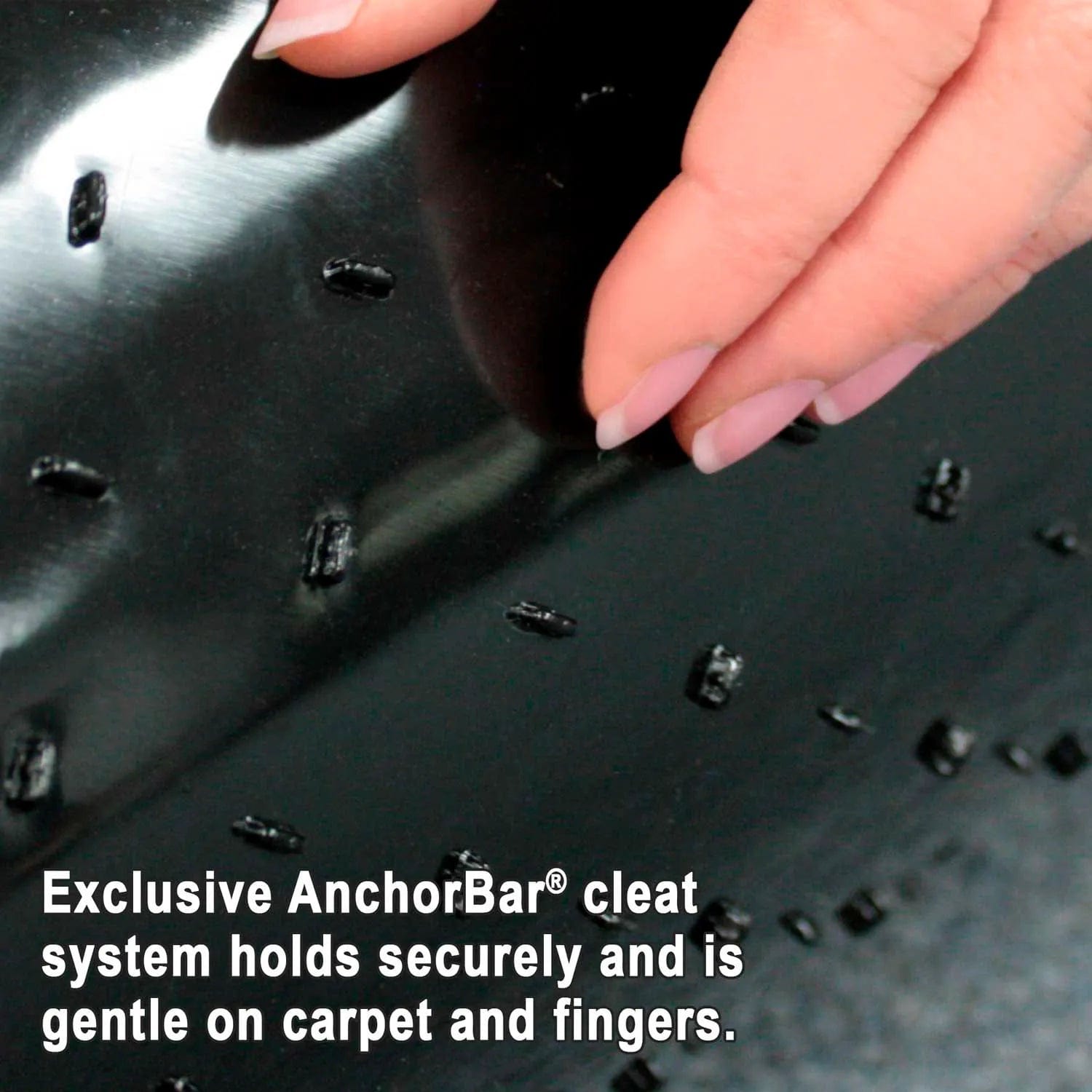 Protects low pile carpet up 3/8" thick (including padding) from caster damage and spills. Easy to handle AnchorBar® carpet cleats. No sharp spikes Black vinyl design with a light surface texture for optimal ergonomic rolling performance. Not just for office chairs. Creative solution for protecting carpeted areas with pets, kids and potted plants. No harsh smell. GREENGUARD Gold Certified for low chemical emissions to UL 2818. Made in USA. Phthalate FREE & Cadmium FREE complete with a "No Crack Mat" Guarantee.