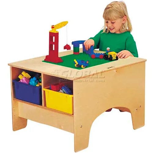 Table size is large enough to accommodate several children but small enough to fit in activity area. One base plate is permanently mounted to tabletop, colors will vary. Duplo® or Lego® compatible base plates. Store bricks in four optional tubs. 25" wide x 28" long x 19" high.
