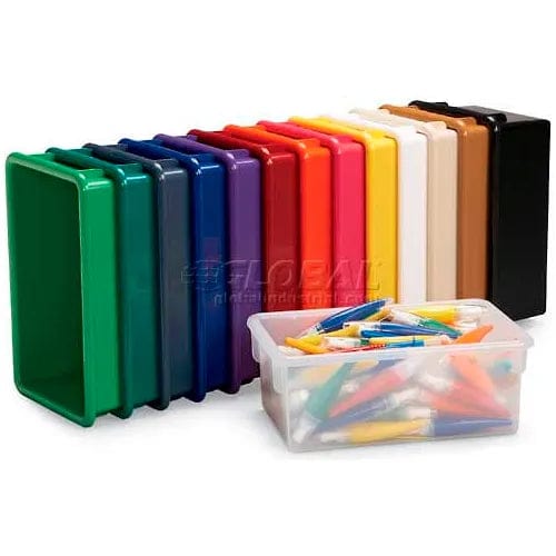 Table size is large enough to accommodate several children but small enough to fit in activity area. One base plate is permanently mounted to tabletop, colors will vary. Duplo® or Lego® compatible base plates. Store bricks in four optional tubs. 25" wide x 28" long x 19" high.
