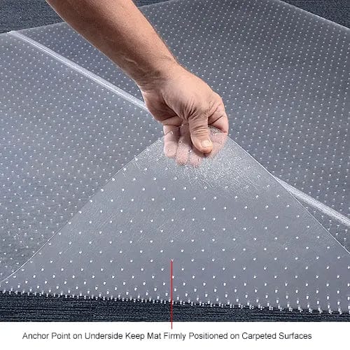 This versatile chair mat immediately unfolds for instant use right out of the box. The ability to fold the mat, reduce its size and easily move it from one are to the next is advantageous for workspaces that change or move. This sturdy, vinyl mat will help prolong the life of valuable flooring by protecting against chair caster wear and tear. Any chair user will be able to maneuver their chair easily and effortlessly, as this mat withstands heavy traffic and features an anti-skid textured top. Mat underside has anchor points to keep mat firmly positioned on carpeted surfaces. This chair mat is ideal for low pile carpet up to 1/4" thick, including padding.