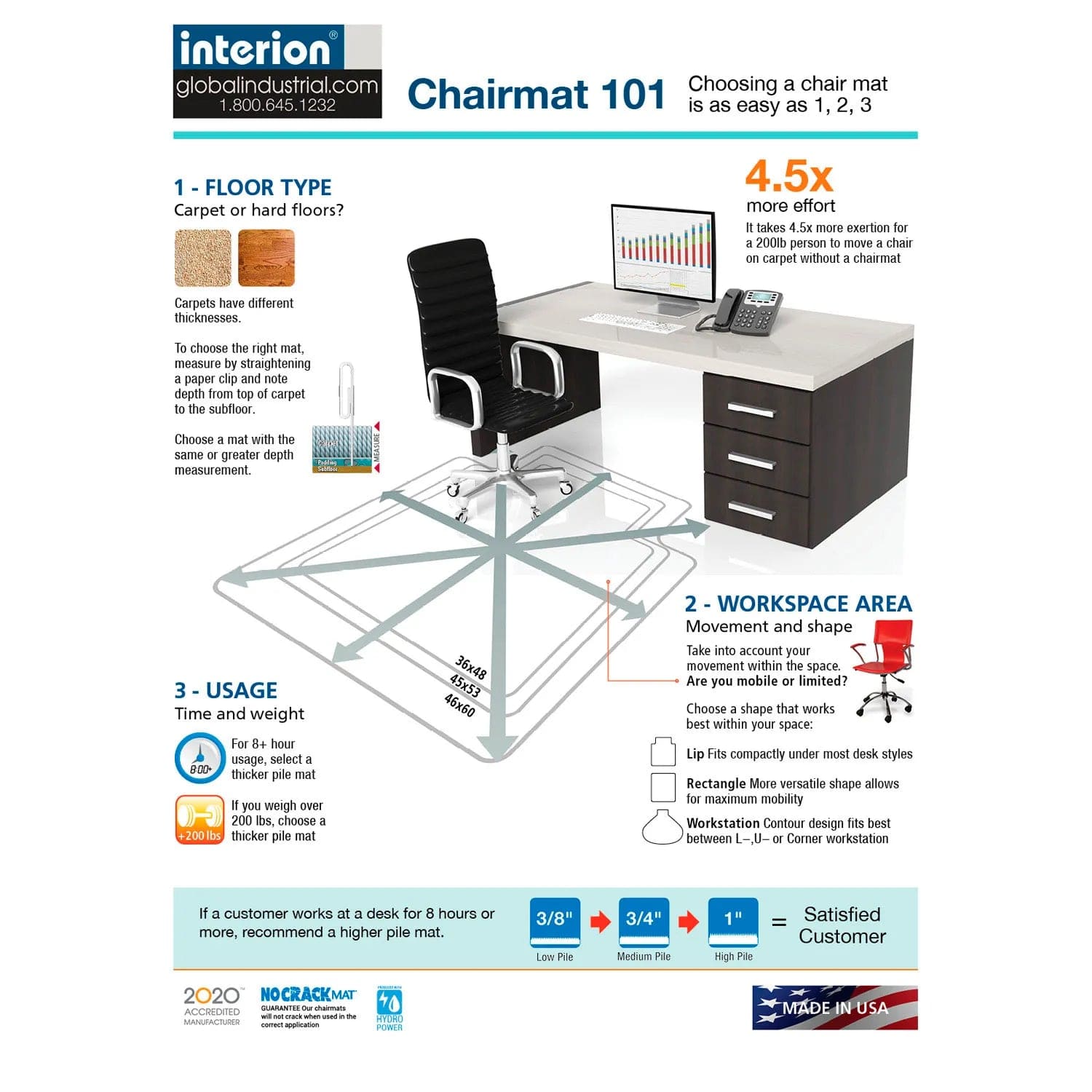 This sturdy, vinyl mat from Interion® By Global Industrial will help prolong the life of valuable flooring by protecting against chair caster wear and tear. Any chair user will be able to maneuver their chair easily and effortlessly, as this mat withstands heavy traffic and features an anti-skid textured top. This chair mat is ideal for use on laminate, wood, tile and other hard floor surfaces.