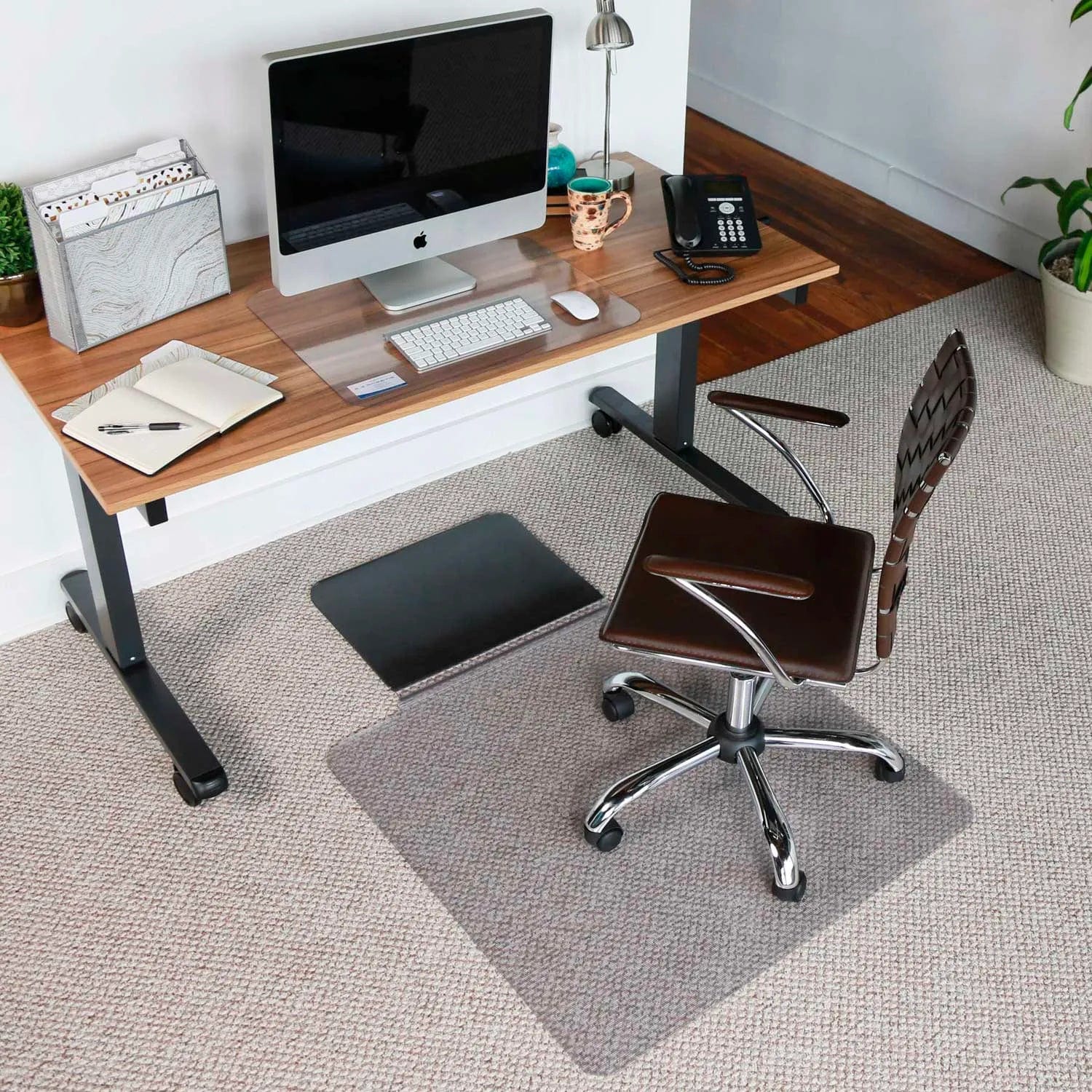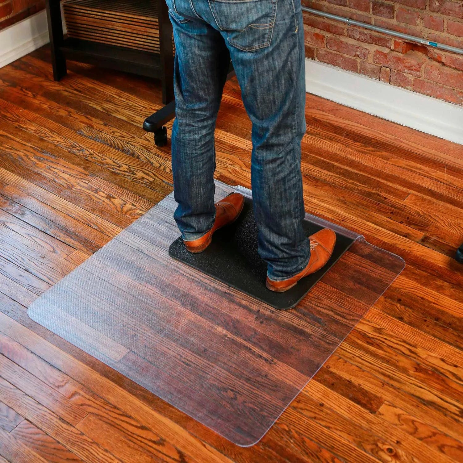 The Sit or Stand Mat™ offers a unique, dual sit to stand desk solution that promotes good health and increased productivity.Innovative hinge folds for cushion when standing and unfolds to full size chairmat while sitting. Chairmat thickness 1/8", Cushioned area is 1/2" thick. Fluted underside grips low pile carpets up to 3/8" thick including padding and hard floors: laminate, wood, tile, and other hard floor surfaces. Made in the USA. 1-year Limited Warranty.