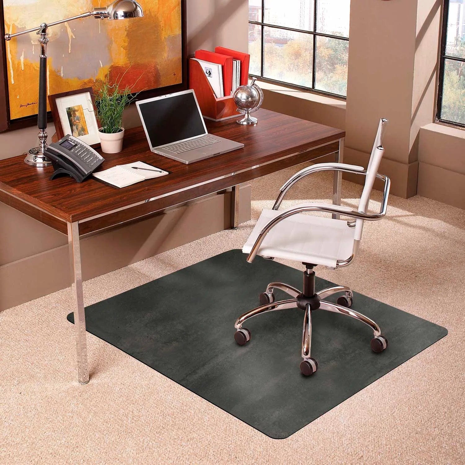 Instantly add style to your workspace with TrendSetter® chair mats. Protects carpets from scuffs, scrapes and chair caster wear. Provides a smooth rolling surface for less stress on legs and back. Use with Medium Pile Carpet up to 3/4" thick (including padding depth). AnchorBar® cleat system that is gentle on hands and carpet, no sharp spikes. Durable vinyl construction. Designed for carpet use, do not use on hard floors. Transform your space with the beauty of a designer chair mat. The ES ROBBINS TrendSetter® collection includes a variety of laminated vinyl chair mats, crafted with a durable decorative top layer, that instantly add style to your workspace.