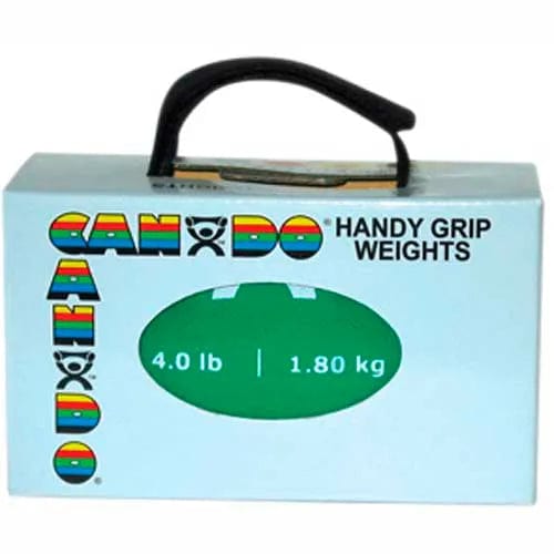 CanDo® Handy Grip™ weight ball offers all the benefits of traditional weight training without using hard-to-hold metal dumbbells. Ergonomic shape makes for easy grasping and textured surface makes it slip-free. Strap ball to hand for added security and for firmer grasp. The strap is adjustable to fit most users. Football shape design with hand strap enables a variety of strength training and functional movements. Available in 6 color-coded weight levels. CanDo® Handy Grip™ Weight Ball - 4 lb. - Green.