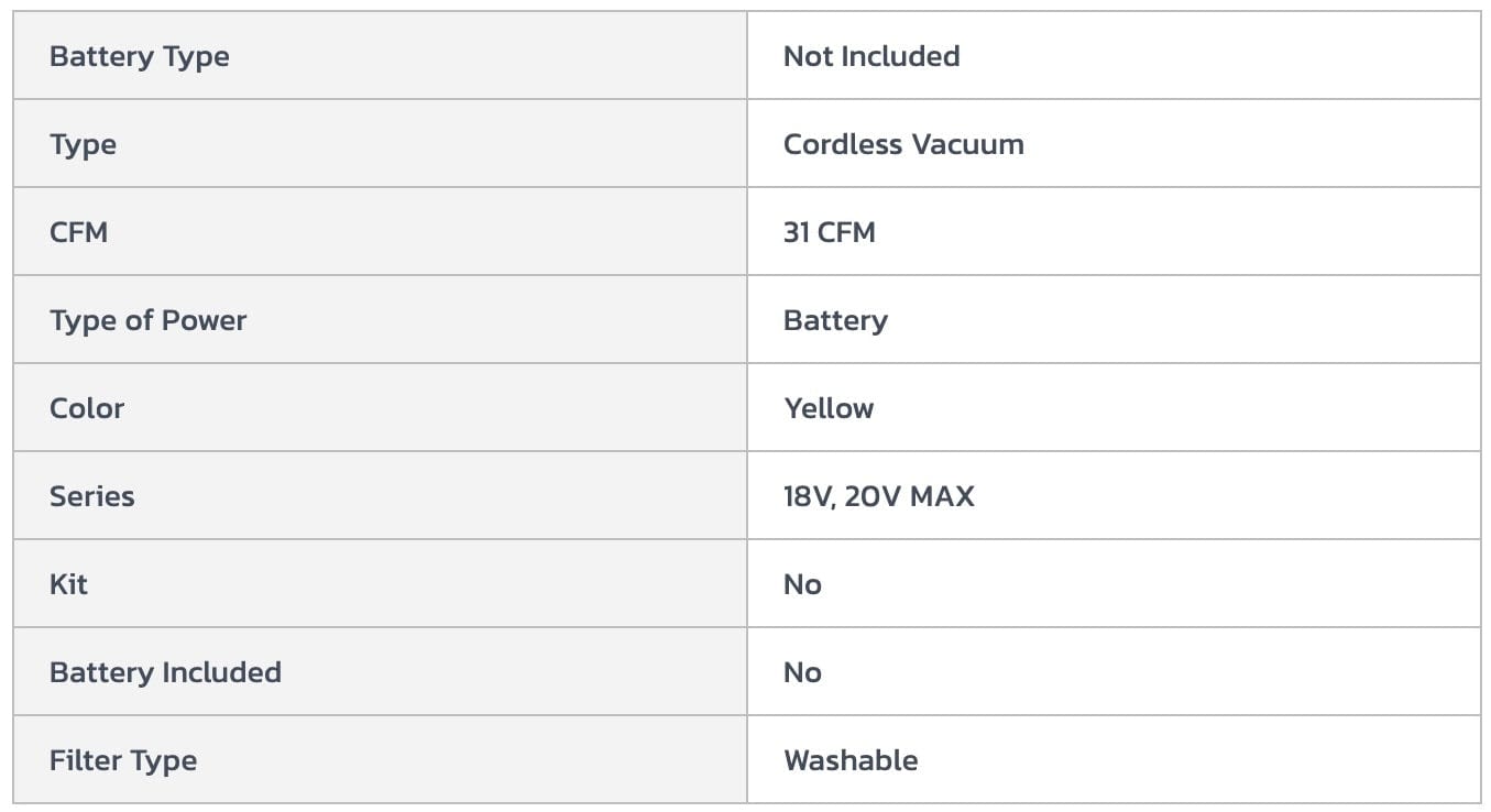 Easily accessible, washable/reusable filter - tap or water rinse to clean. Heavy-duty, crush-resistant, fully-integrated 5' (by 1-1/4diameter) hose provides durability, flexibility and ease-of-use. On-board hose and accessory storage makes the vacuum easy to carry/transport. Tank capacity provides enough storage to empty a toilet or clogged pipe. Also included are crevice tool and wide nozzle tool attachments. 7.98 lb (pound). Battery and charger sold separately. No. DCV580: Tank Capacity: 2 gal, Color: Yellow/Black, Filter Type: Washable High Efficiency, Voltage Rating: 18V or 20V, Pkg Qty: 1, Package Type: Box