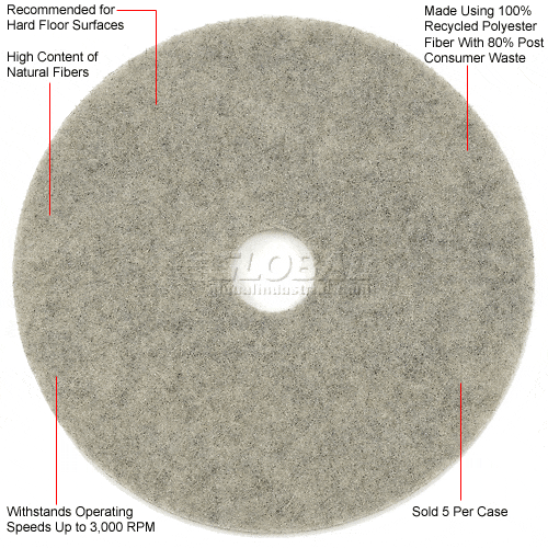 Pad is made using 100% recycled polyester fiber with 80% post consumer waste. Utilizes water-based latex resins in binding process to eliminate hazardous resins. Burnisher pad is for use with machines up to 3,000 RPM. Burnishing pad contains a high content of natural fibers. Ideal for minimal burnishing on hard surfaces. Sold 5 per case.