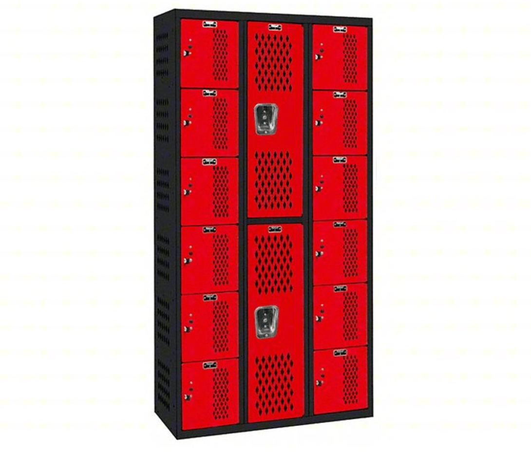 Centerline Dynamics Welded Gym And Pe Lockers Hallowell PE / Gym Locker, 36"W x 18"D x 72"H, 708 Midnight Ebony Body and 721 Relay Red Doors, Six Tier / Double Tier / Six Tier, 3-Wide