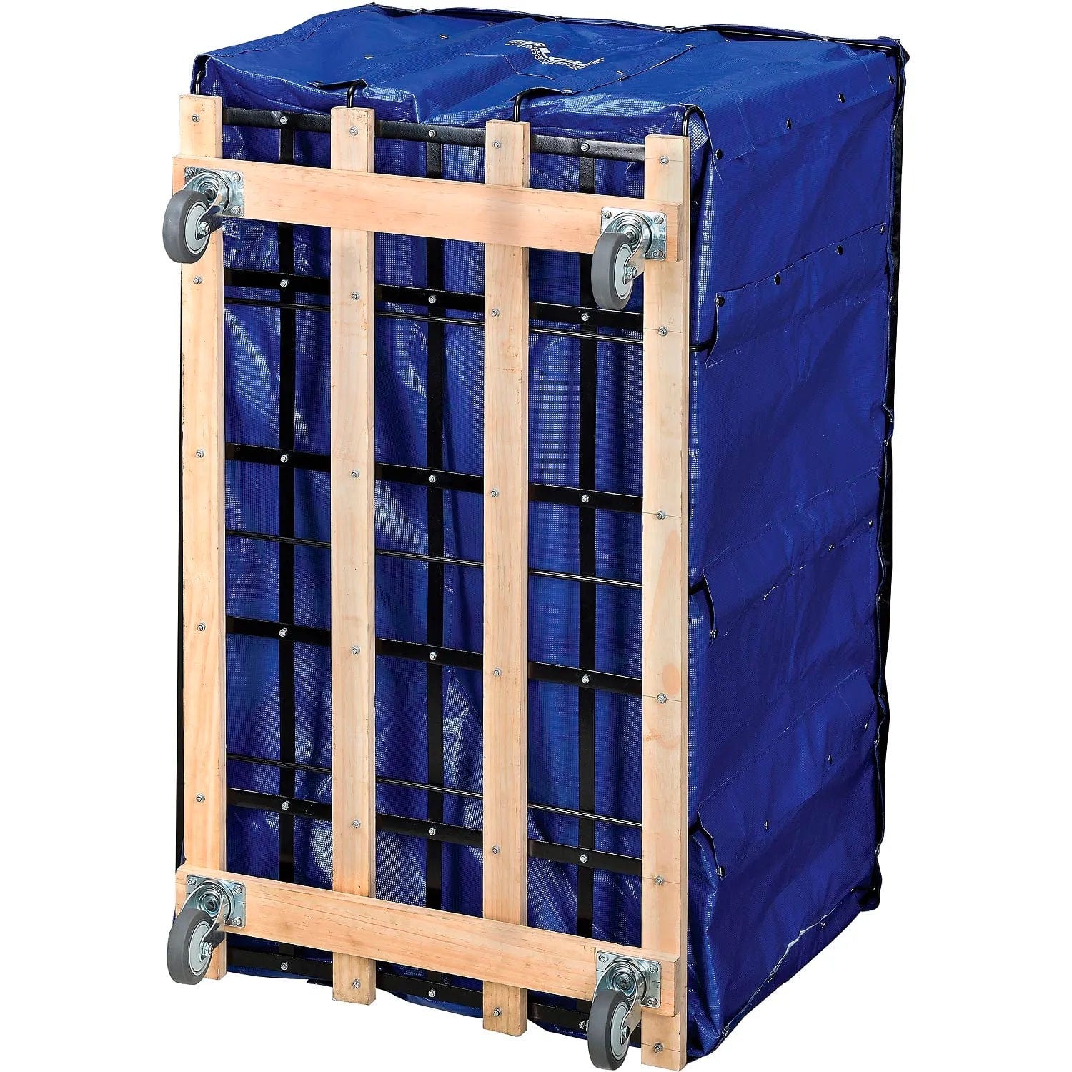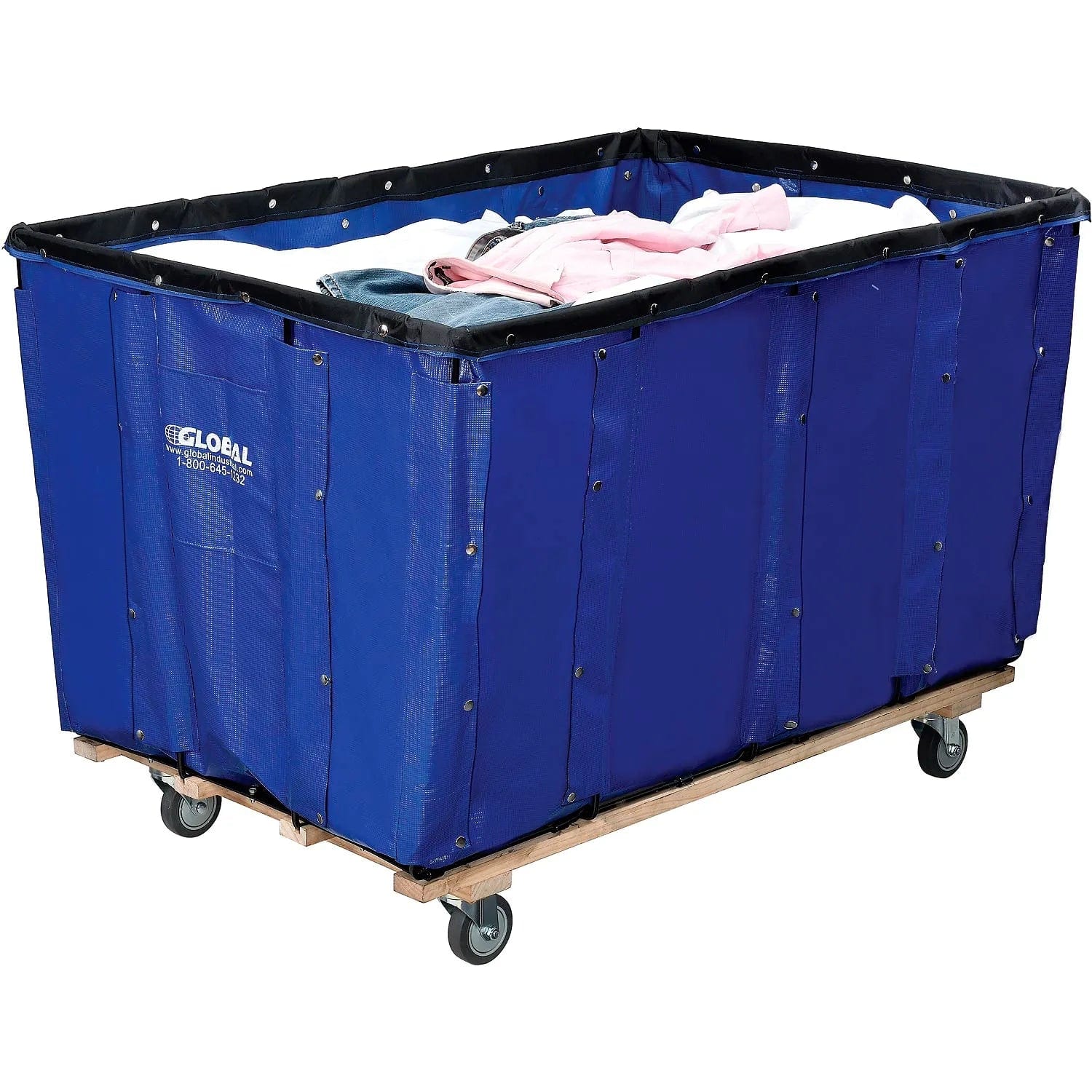 This durable vinyl truck is equipped for years of commercial laundry collection, mail distribution or rugged material handling. Vinyl coated nylon body offers a smooth, puncture resistant, and easily cleaned surface. Strong Kiln-dried hardwood base, welded steel frame and 4" swivel non-marking rubber casters easily move heavy loads. Wear-guard edge offers maximum abrasion protection. Two document pockets and twin reinforced pull handles. Shipped assembled.