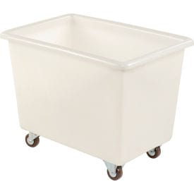 Seamless molded polyethylene will not leak and has smooth walls and corners for easy cleaning. 0.225" wall thickness for superior durablility. Trucks nest when empty to save space. 2 swivel, 2 rigid rubber casters for smooth rolling. Limited 1 year warranty.