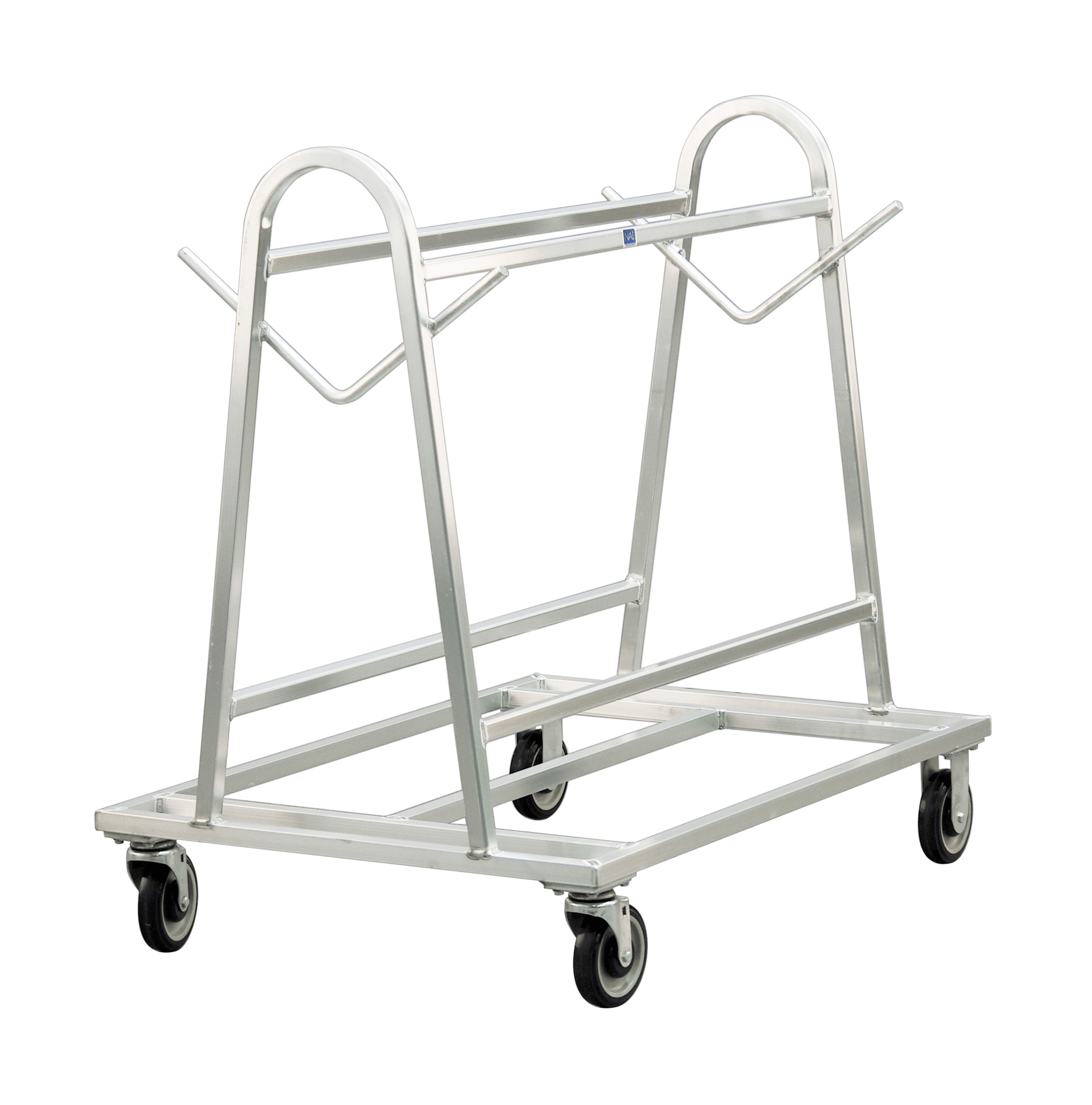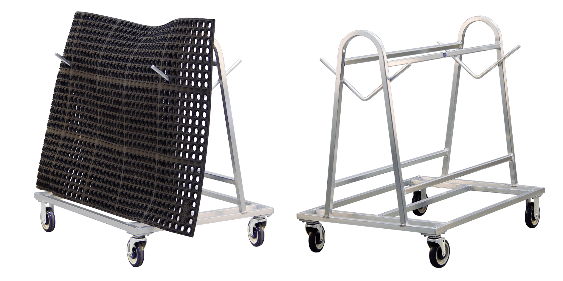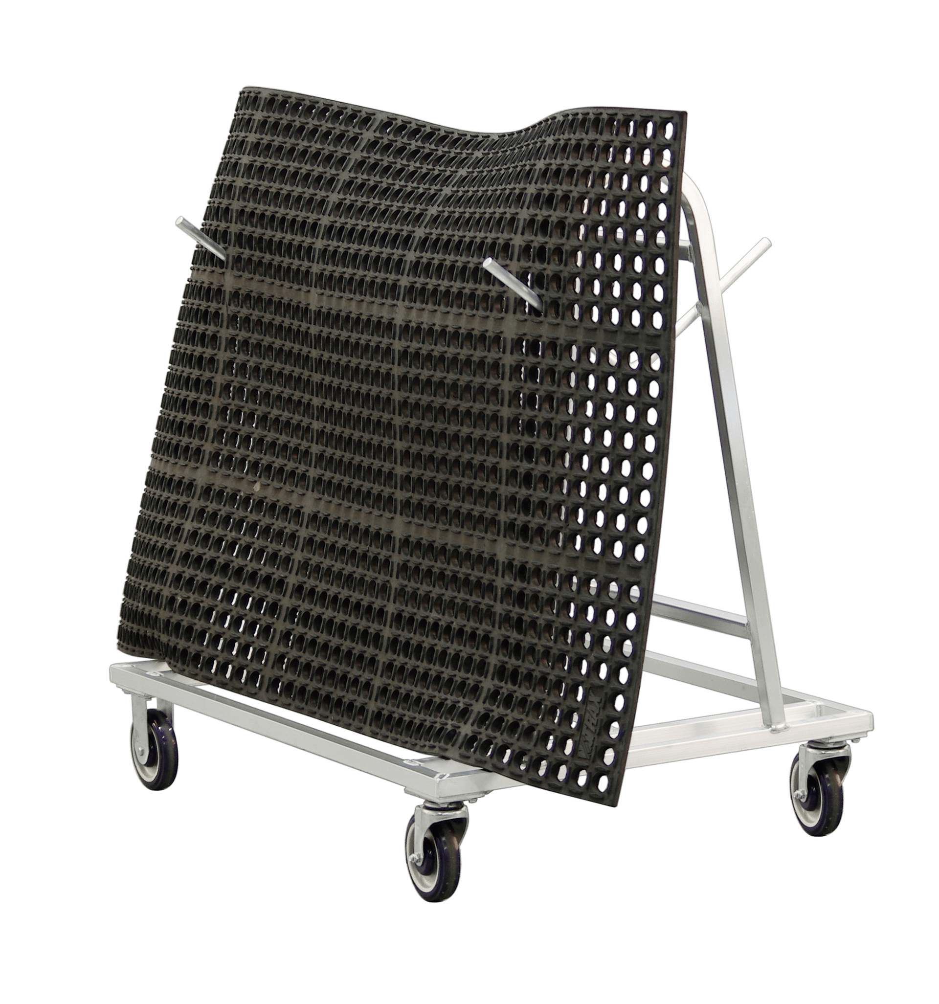 Proper mat management is a huge concern in many industries including K-12 schools, bars, restaurants, chains, and more. Our labor-saving Mat Carts help get soiled mats off the floor for efficient cleaning and storage. Welded pegs, or hooks, secure perforated mats directly to the cart for easy power washing, sanitizing, and drying. Just hook the dirty mats onto the pegs of the cart and roll them to the wash station instead of carrying heavy mats back and forth. Then hose them off and leave them hanging on the cart to dry. The primary grade aluminum construction will not rust or corrode.