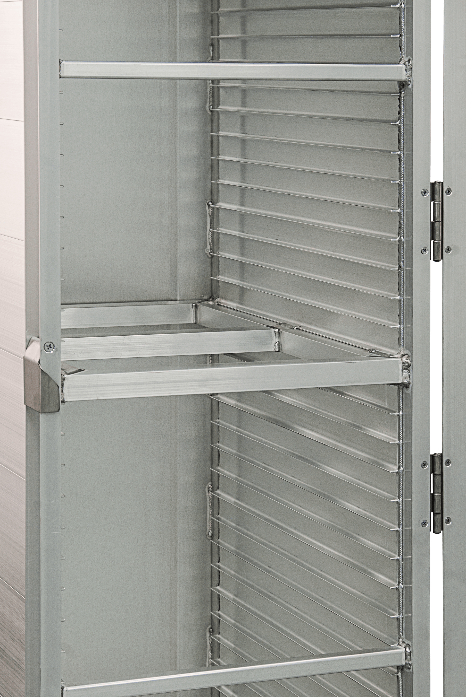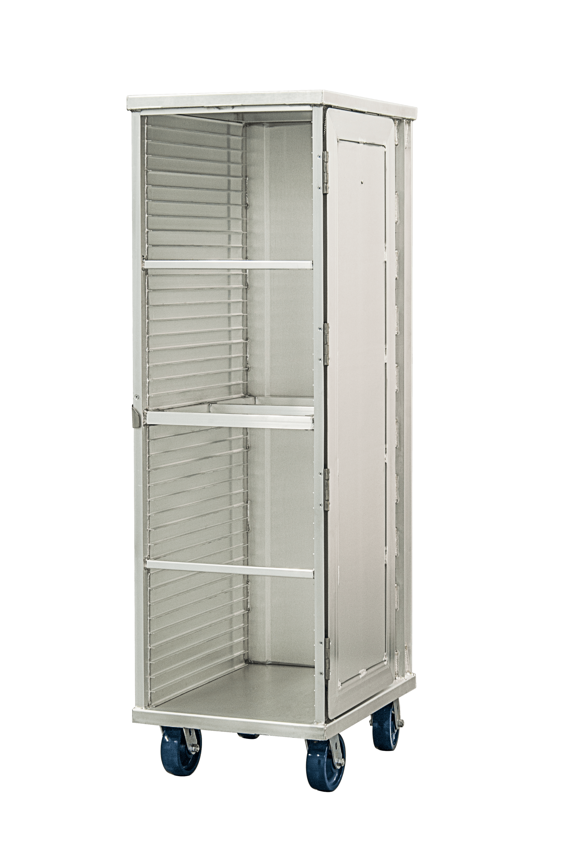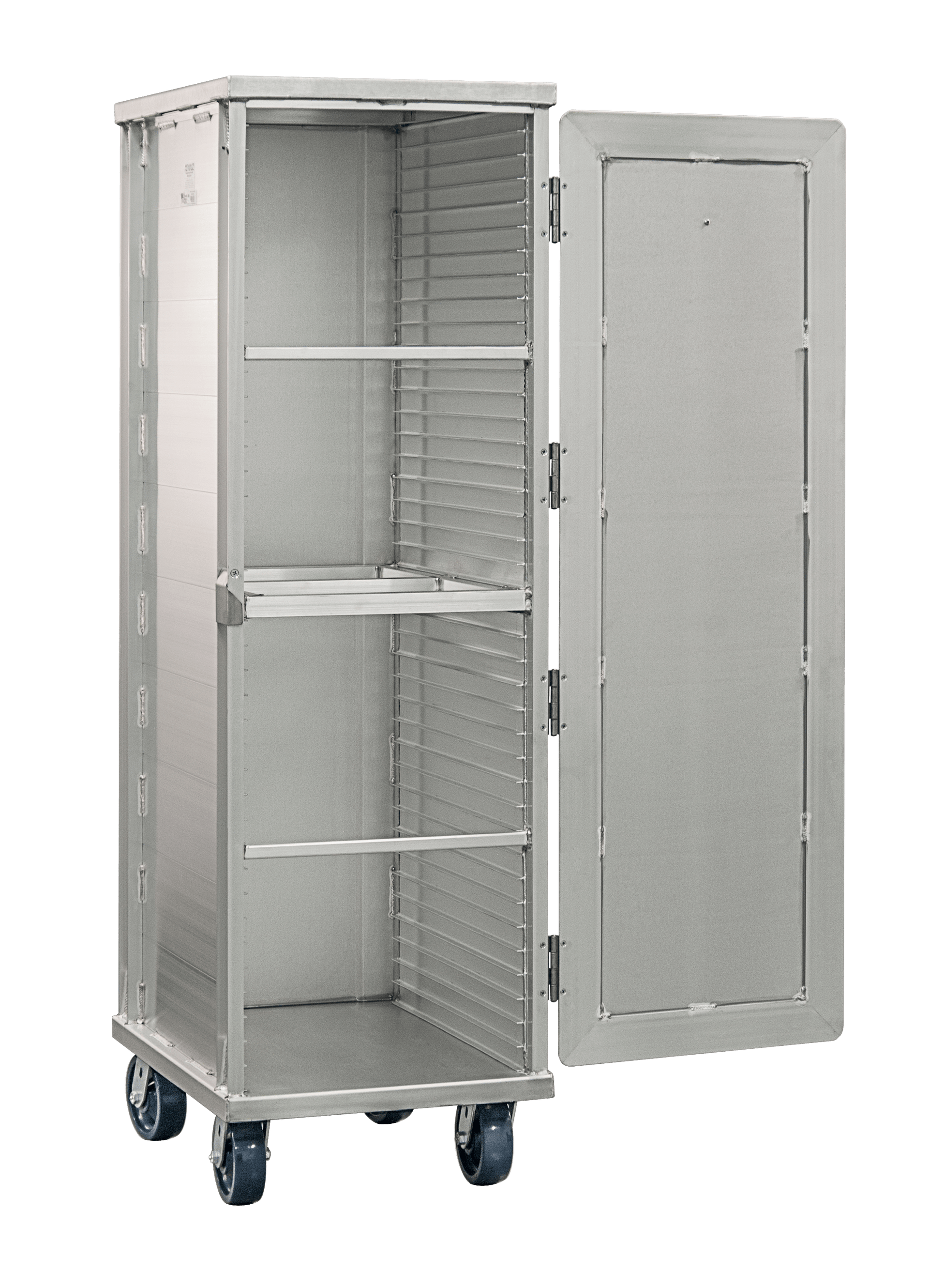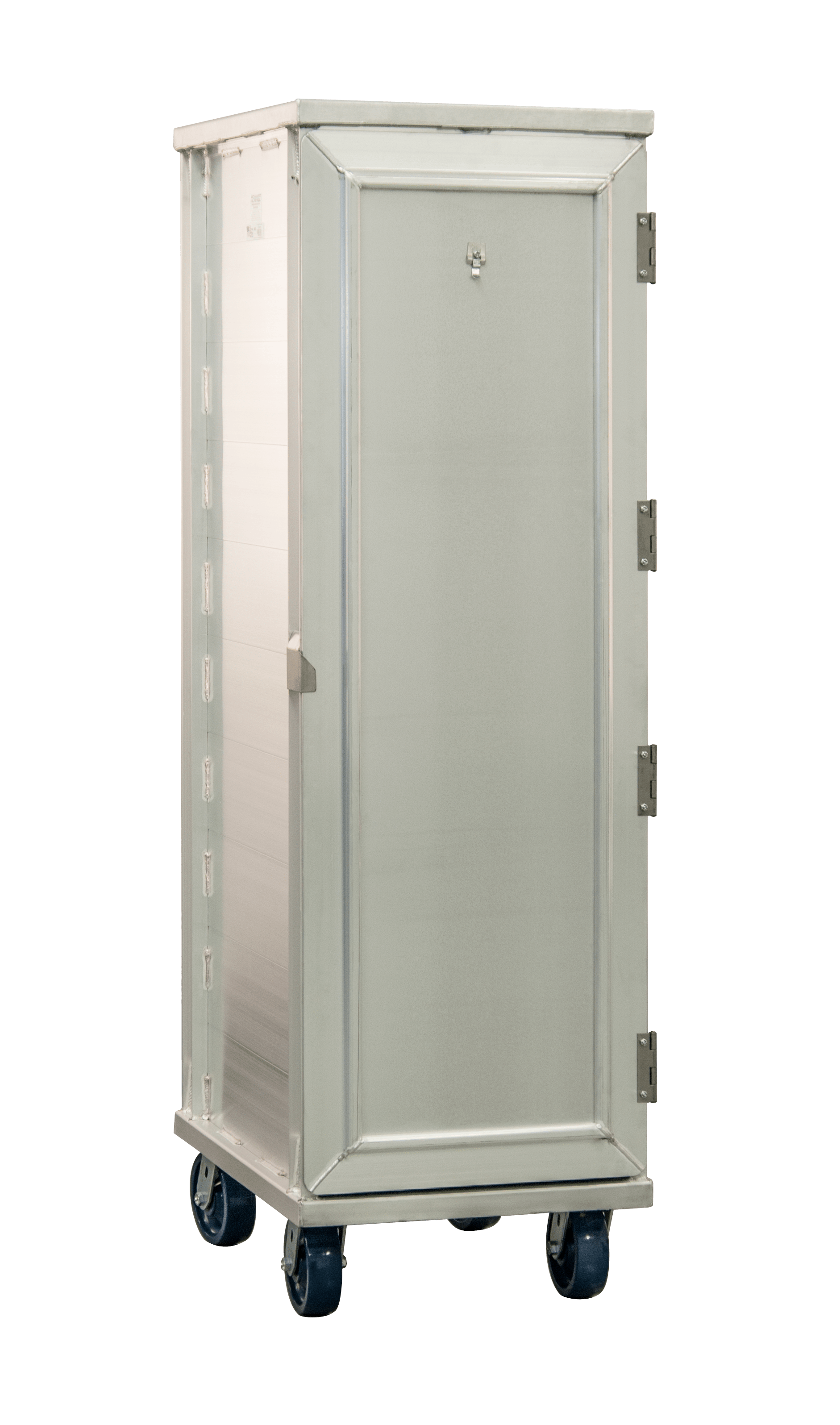 The Lifetime Transport Cabinet is the toughest Enclosed Cabinet in the industry. These mobile cabinets are built to withstand the rigors of on/off truck and transport use. It’s full-height with a heavy-duty base. The formed door and rear panel create a chimney effect allowing air to circulate freely from top to bottom. Solid side panels are composed of interlocking aluminum extrusions with guides spaced on 1.5″ centers for maximum capacity. These units are secured with heavy-duty tie rods and equipped with four swivel casters and non-marking wheels. Each unit is all welded with all seams sealed providing a smooth, easy to clean surface.