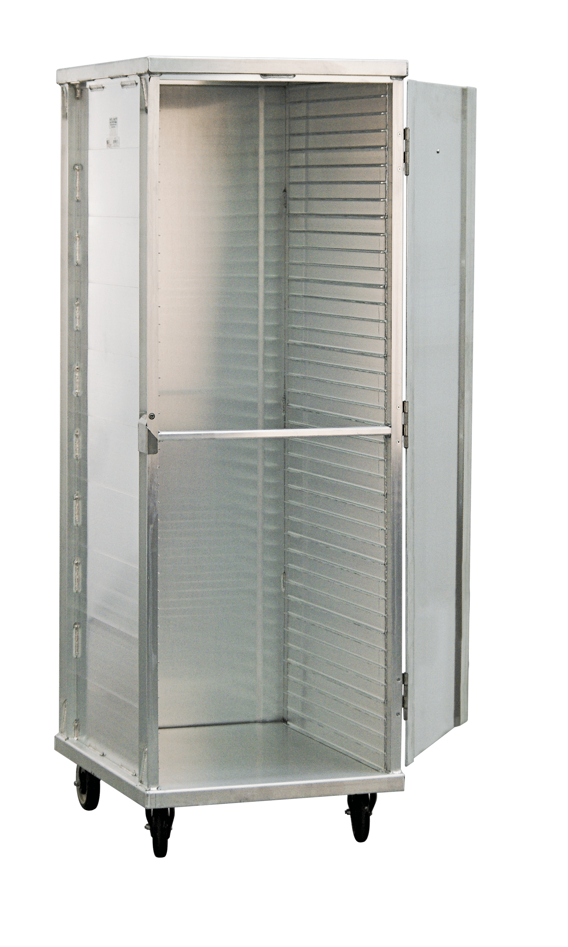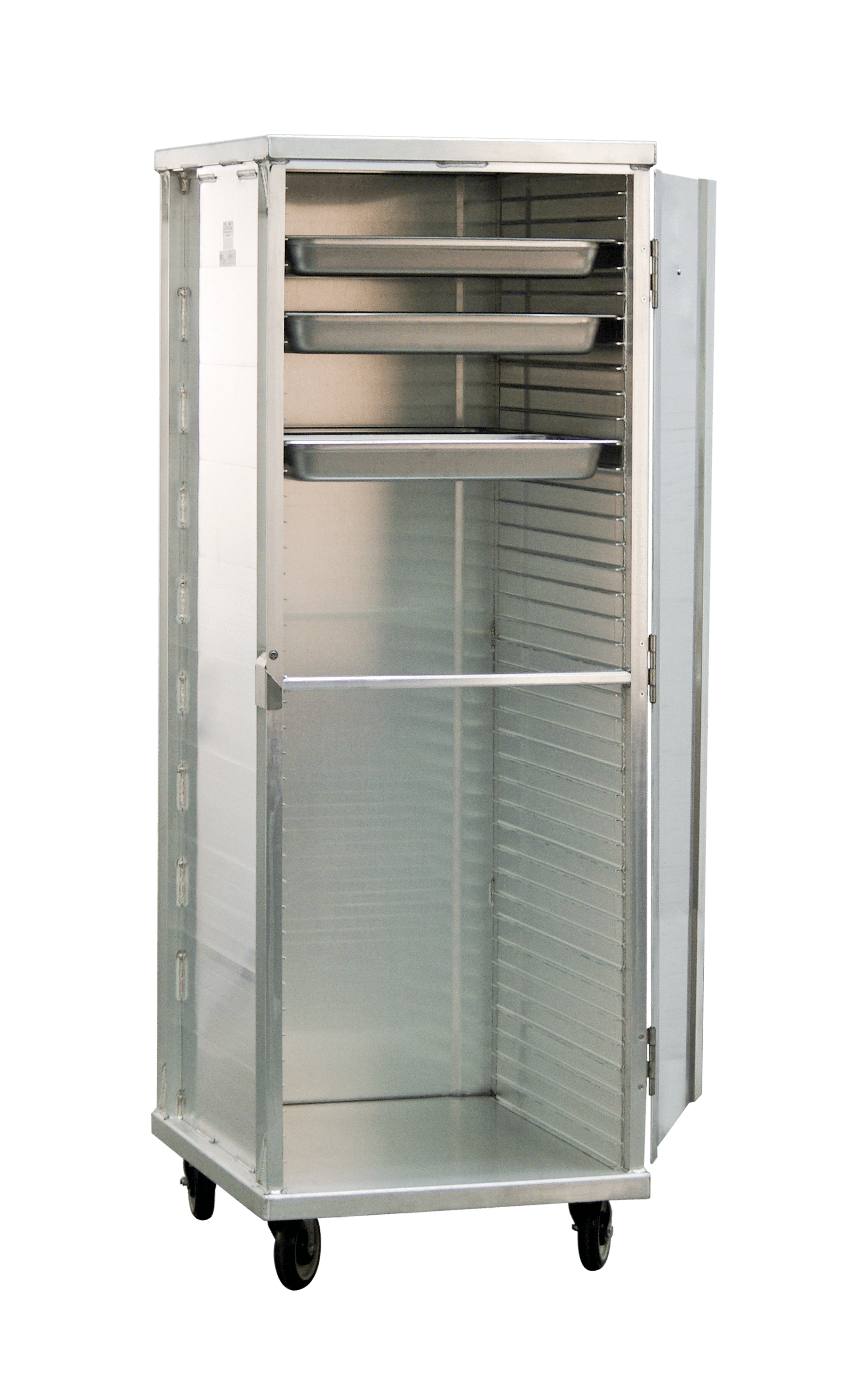 Steam Table Pan Enclosed Cabinets are clean, high volume storage cabinets that are ideal for food storage and delivery of 12” x 20” steam table pans (4″ deep). These cabinets have all seams fully welded and sealed with no cracks or crevices to trap dirt! The formed door and rear panel create a chimney effect allowing air to circulate freely from top to bottom. The solid side panels are composed of interlocking aluminum extrusions with guides. They come equipped with four 5” platform swivel type heavy duty casters with non-marking wheels.