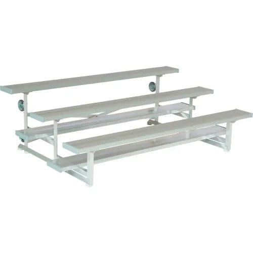 The National Rep Bleacher Series offer customers a quality, economical stationary bleacher seating option. Bleacher, 3 Row x 24'-0"L, (10" Nominal Seat Planks, 10" Nominal Tread Planks, 17" Front Row Seat Height, 8" Rise, 24" Tread), Aluminum Frame, Single Footboards, Mud Sills