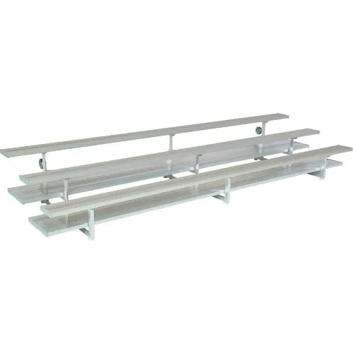 The National Rep Bleacher Series offer customers a quality, economical stationary bleacher seating option. Bleacher, 3 Row x 24'-0"L, (10" Nominal Seat Planks, 10" Nominal Tread Planks, 17" Front Row Seat Height, 8" Rise, 24" Tread), Aluminum Frame, Single Footboards, Tip N Roll Kit