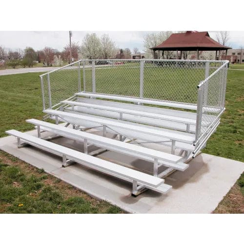 Corrosion resistant aluminum bleachers feature guardrails for spectator safety. Lightweight aluminum bleachers provide an economical, maintenance free seating solution for indoor or outdoor sporting events. Bleachers are made of extruded aluminum alloy to ensure uniform strength with aluminum angle frame for durability and reinforcement. All seat boards are satin anodized to prevent oxidation or discoloring. Aluminum bleachers include double floor planks with 8" rise. These 5 row bleachers include 54"H guardrails for safety. 5 Year Limited Warranty.