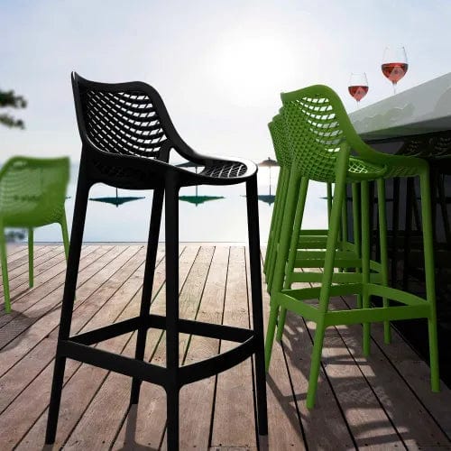 Air resin outdoor bar height stool. Modern design. Made from polypropylene resin with gas injection molded legs. Suitable for indoors and outdoors. Perfect for heavy use areas. Suitable for restaurants, cafes and hotels. Air bar stools are not stackable.
