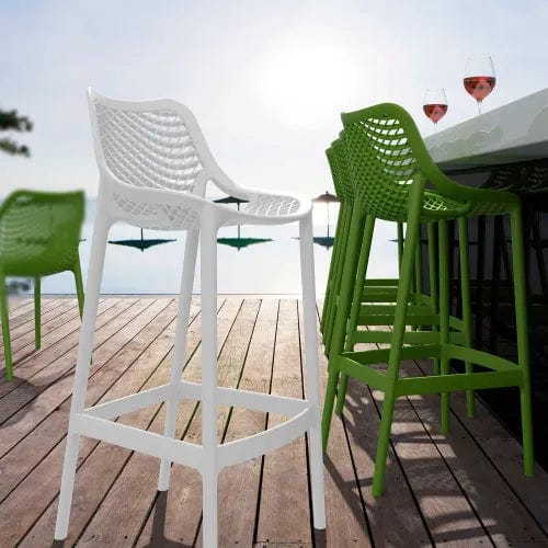 Air resin outdoor bar height stool. Modern design. Made from polypropylene resin with gas injection molded legs. Suitable for indoors and outdoors. Perfect for heavy use areas. Suitable for restaurants, cafes and hotels. Air bar stools are not stackable.