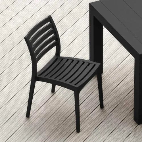 Ares resin outdoor dining chair. Simple design. Commercial strength. Made from commercial grade resin with gas injection molded legs. 100% polypropylene construction resists salt, chlorine, suntan oils and UV rays. No metal parts. Heavier than most resin chairs of its type. Good for heavy use areas. Preferred by restaurants, cafes and hotels. Stackable for easy storage.