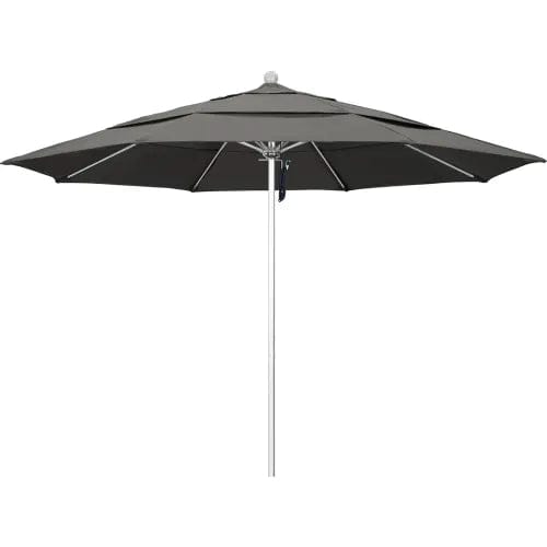 11' Venture Series Patio Umbrella With Silver Anodized Finish, Aluminum 2 Piece Center Pole, Fiberglass Ribs, Pulley Lift With Pin Stop, With Sunbrella 1A Charcoal 54048 Fabric Canopy and Double Wind Vent. 1 year against defects and fade warranty.