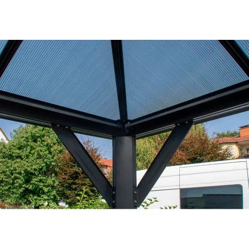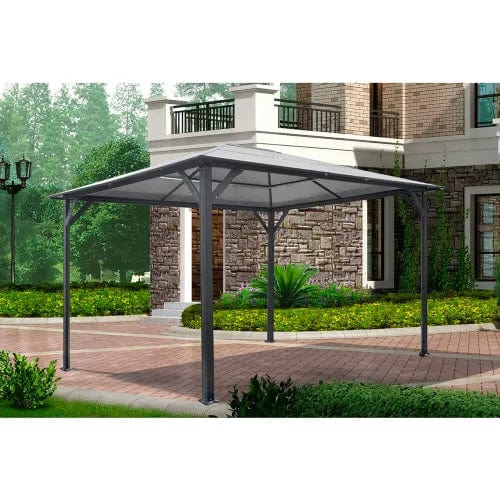 Create a comfortable outdoor living room or dining room with this elegant Hardtop Gazebo by Hanover. This modern outdoor structure not only adds style to your backyard but also offers shade from the sun's harsh rays while allowing a cool breeze to pass through. Stronger and lighter than glass, the opaque polycarbonate panels are high-impact, shatter resistant, and block harmful UV rays. The all-weather aluminum is finished with a high-performance powder coating to resist rust and corrosion for year-round use. Four strong, durable posts with corner braces and full-feet anchor kits keep it stable for years of enjoyment. Enjoy family, friends, and outdoor living under your new Hanover gazebo. Strong and Durable: Includes 4 posts with full-feet anchor kits to ensure the Gazebo is secured.