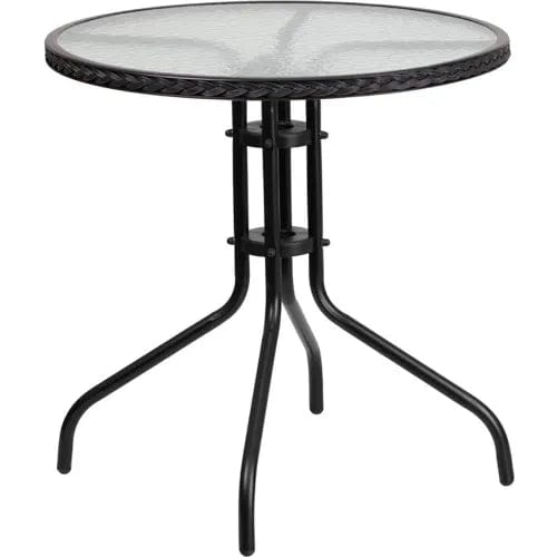 - Round Table: Top Size: 28" Round, 5mm Thick Glass, 1.25" Edge Top, Decorative Black Rattan Edge Band