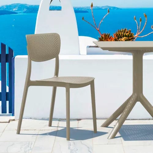 Lucy outdoor bistro set with two dining chairs and one square table. Contemporary design. Made from commercial grade resin with gas injection molded legs. Extremely durable for outdoor temperatures. Easy cleaning. Perfect for heavy use indoor outdoor areas.