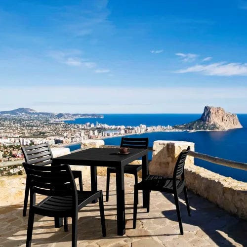Black Ares resin dining set with 4 chairs and one square dining table. Super sturdy commercial strength. Chairs are made from commercial grade resin with gas injection molded legs. Both chairs and table offer 100% polypropylene construction. No metal parts. Chairs are heavier than most resin chairs of its type. Dining set is perfect for heavy use areas. Set items are 100% resistant to outdoors, sun, snow, salt. Resin is virtually maintenance free.