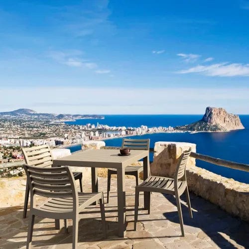 Dove Gray Ares resin dining set with 4 chairs and one square dining table. Super sturdy commercial strength. Chairs are made from commercial grade resin with gas injection molded legs. Both chairs and table offer 100% polypropylene construction. No metal parts. Chairs are heavier than most resin chairs of its type. Dining set is perfect for heavy use areas. Set items are 100% resistant to outdoors, sun, snow, salt. Resin is virtually maintenance free.