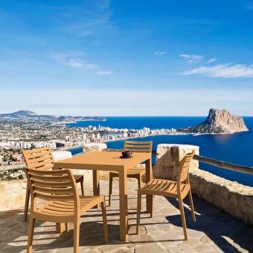 Teak Brown Ares resin dining set with 4 chairs and one square dining table. Super sturdy commercial strength. Chairs are made from commercial grade resin with gas injection molded legs. Both chairs and table offer 100% polypropylene construction. No metal parts. Chairs are heavier than most resin chairs of its type. Dining set is perfect for heavy use areas. Set items are 100% resistant to outdoors, sun, snow, salt. Resin is virtually maintenance free.