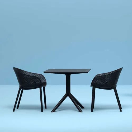 Sky outdoor bistro set with two dining chairs and one 31 inch dining table. Simple modern European design. New addition to our indoor-outdoor transitional chairs. It's made with polypropylene construction and a poly seat. Chair legs are reinforced with fiber glass. Contemporary chairs can be used indoors or outdoors. Chairs are maintenance free. Made for commercial use in hotels, restaurants and heavy use areas. Tested and certified for strict European standards by CATAS Italian research institute and test laboratory. Easy Assembly required.