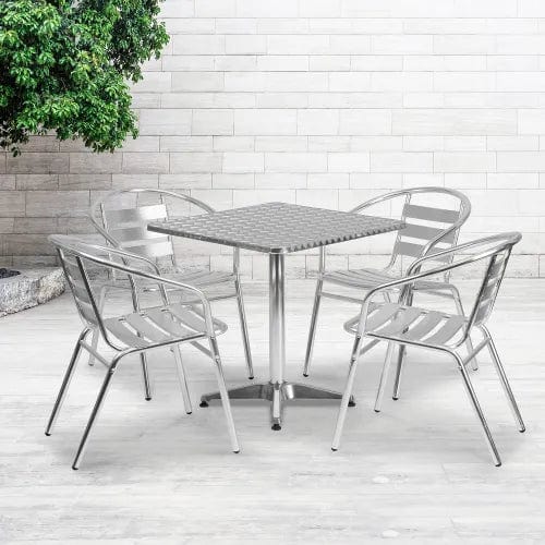 - Square Aluminum Outdoor Dining Table Set w/ 4 Slat Back Chairs