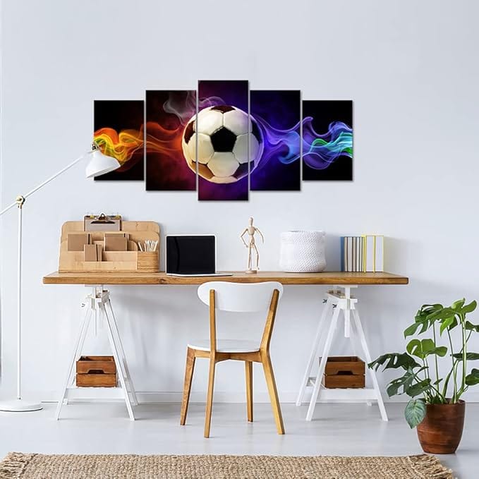 5 Panels Soccer Ball Fire Poster Canvas Wall Art gives a powerful experience of sense with lively brushwork color. It adds enthusiasm and excitement to the space.