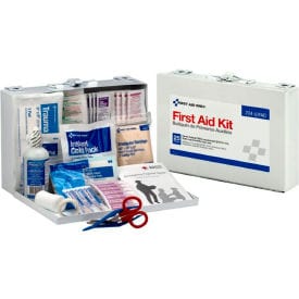 This 107-piece first aid kit is ideal for contractors, fleet vehicles, worksites or small companies with up to 25 employees. It meets federal OSHA recommendations and carries 17 critical products including a 4 oz. eye wash. The strong metal case is wall mountable yet has a handle for easy carrying.